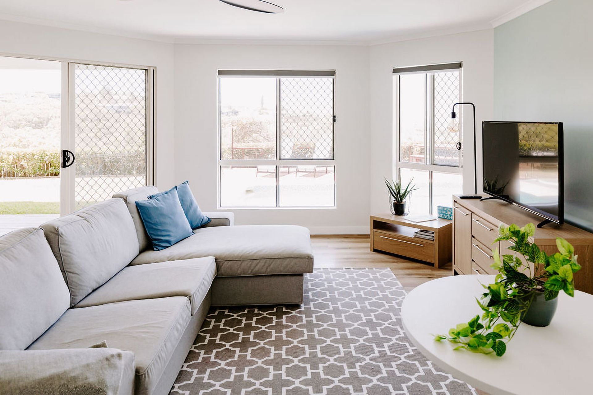 The immaculate brand new kitchen, expansive living and dining area are on the middle level as well as 2 bedrooms (1 x queen, 1 x single + trundle), family bathroom, laundry plus a second living room/gaming room with PS4 and DVDs, perfect for the kids.