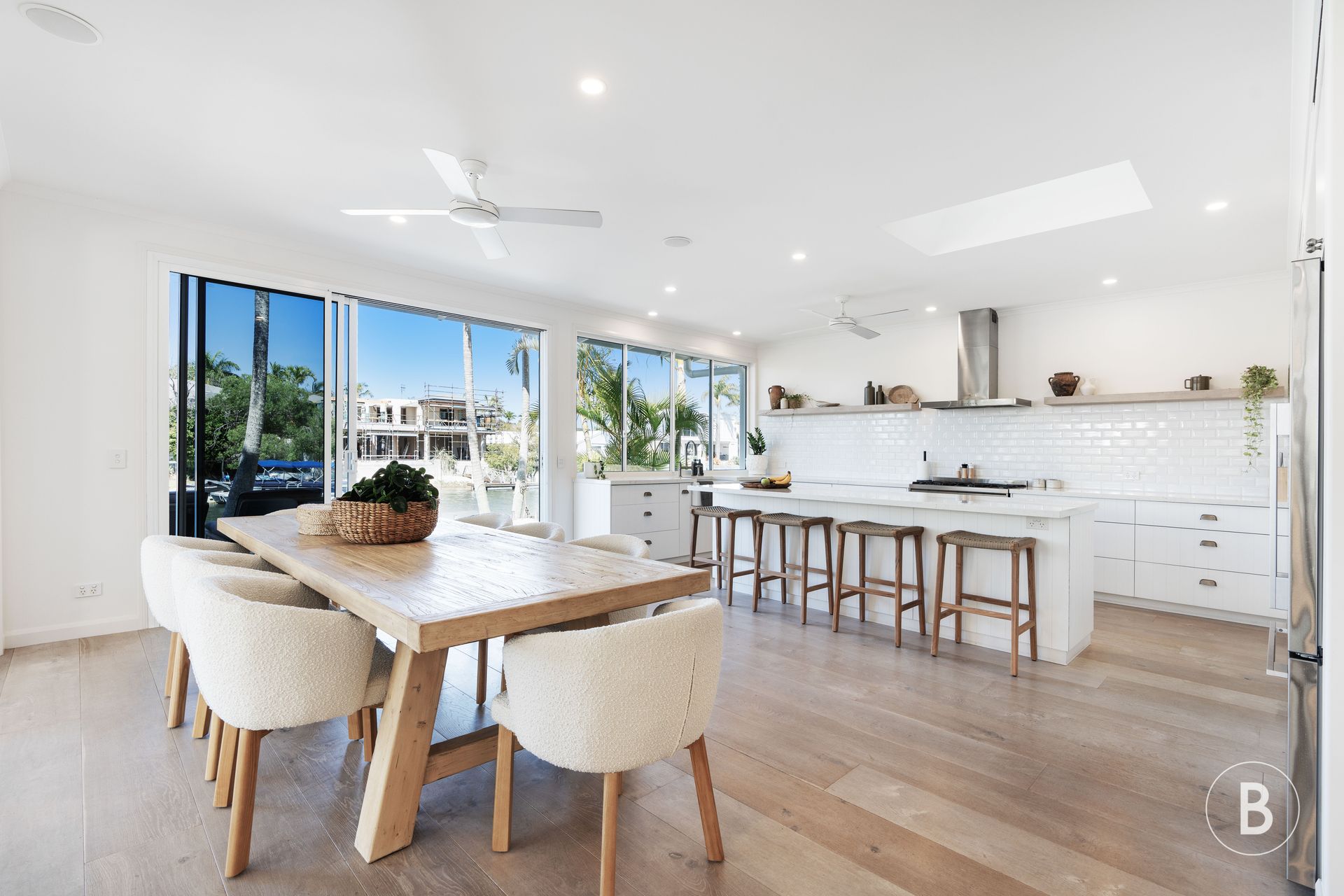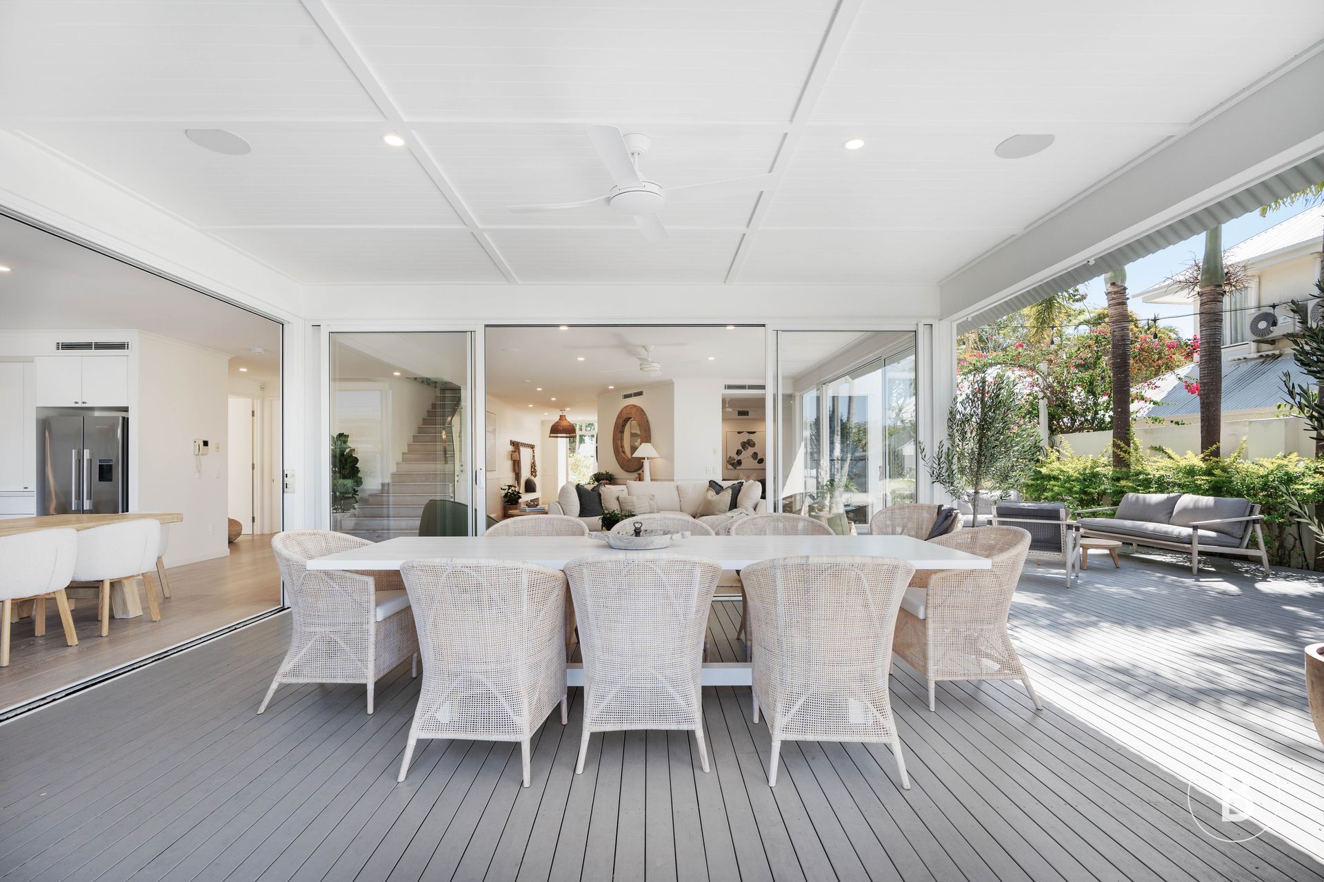 The open and airy design seamlessly merge indoor and outdoor living throughout the downstairs space and provide multiple dining areas.