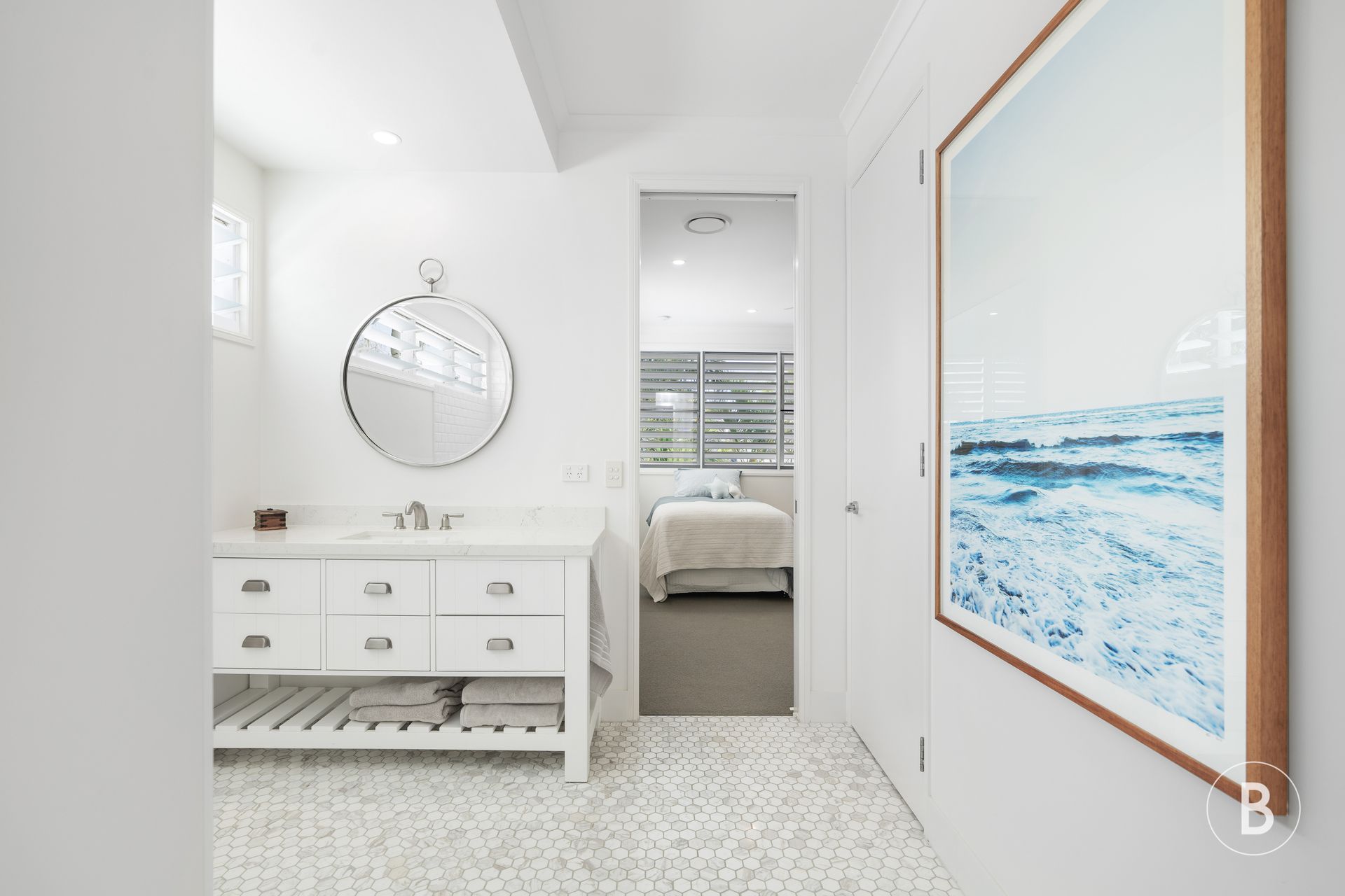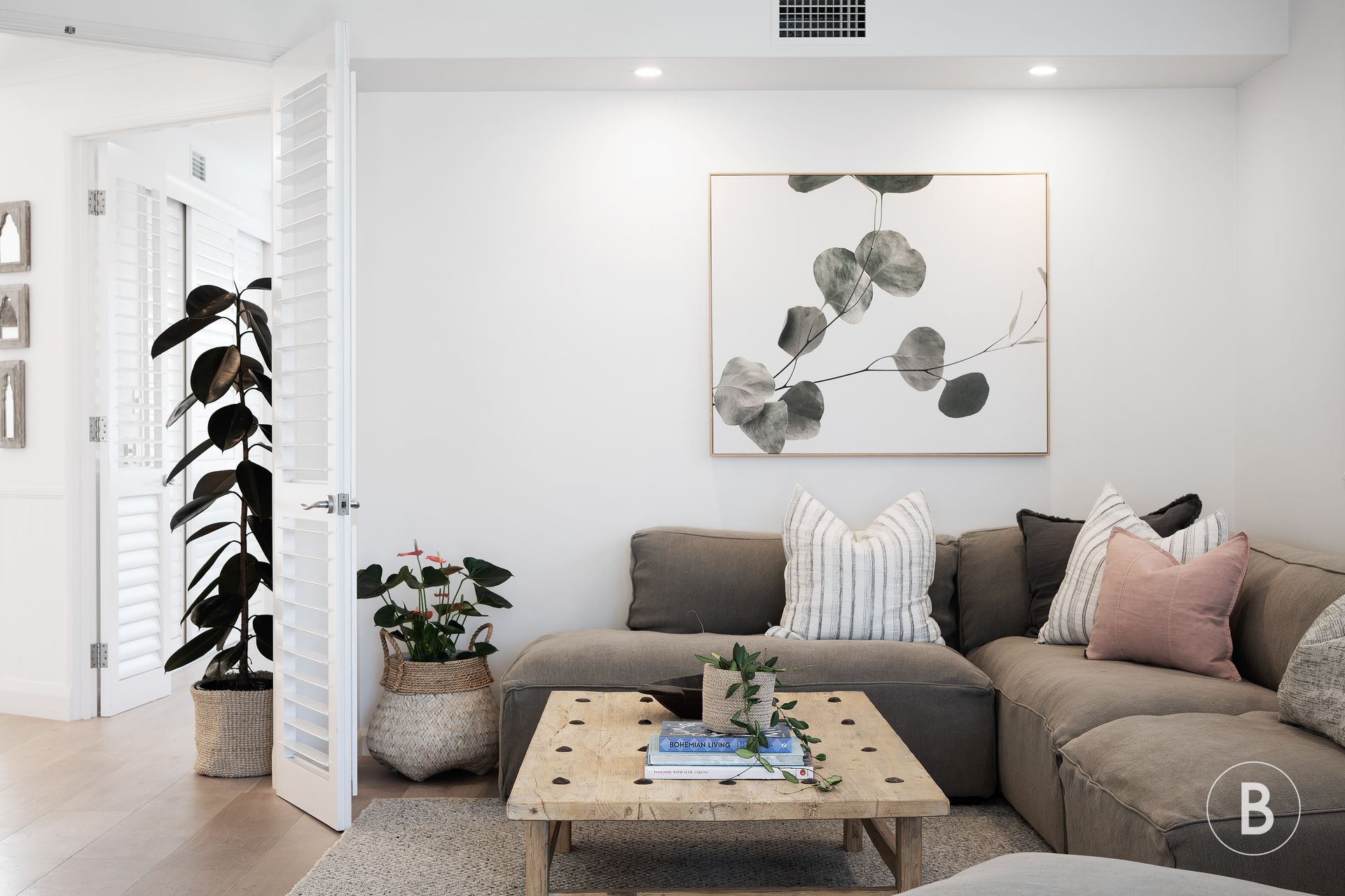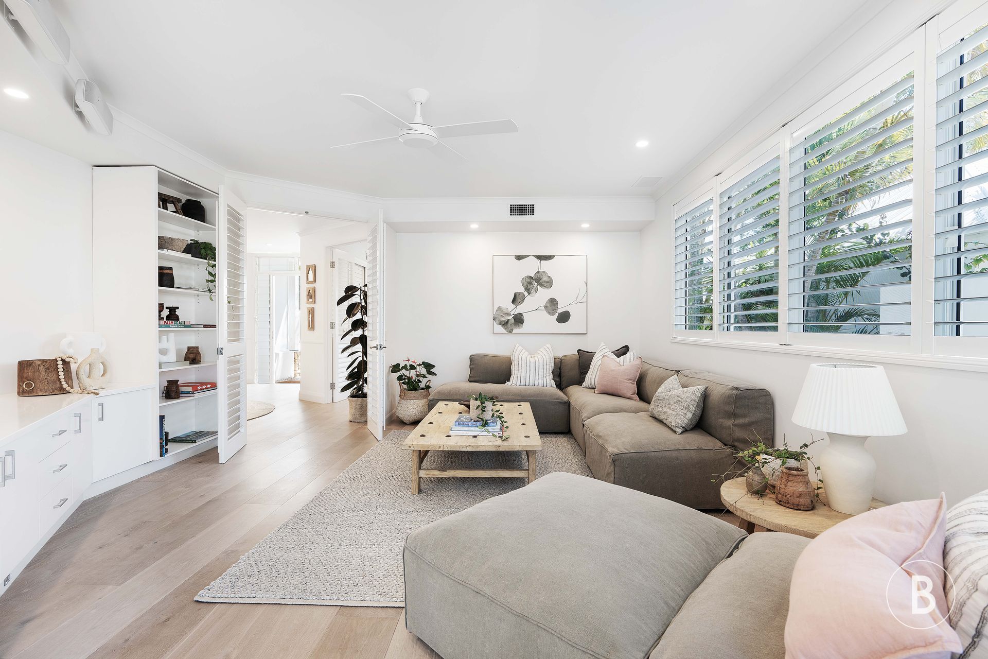 – Lime-washed timber floors & aluminum plantation shutters;