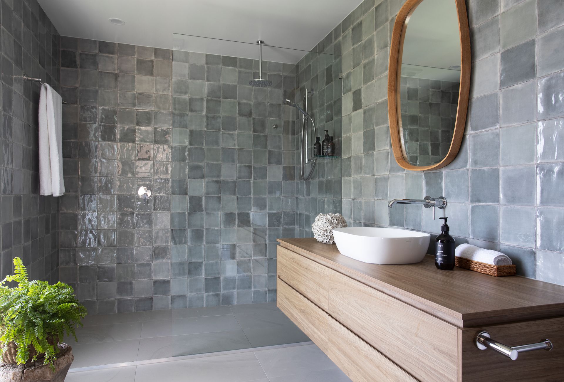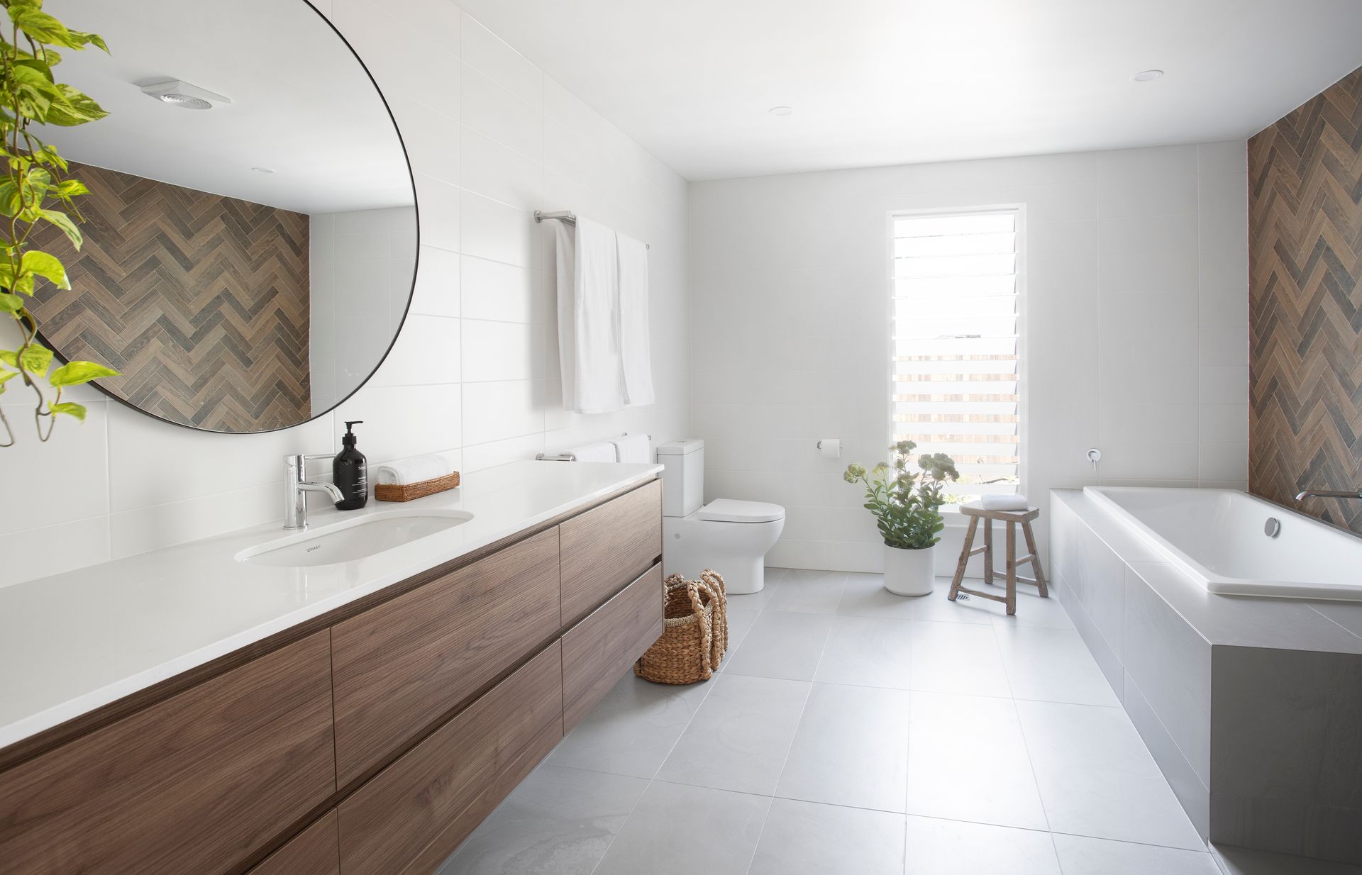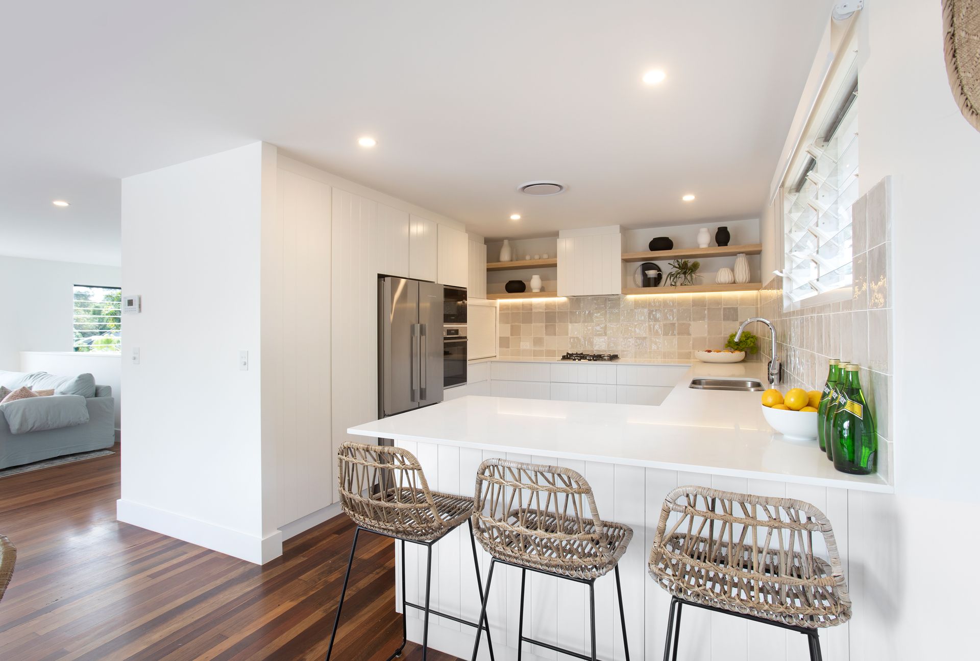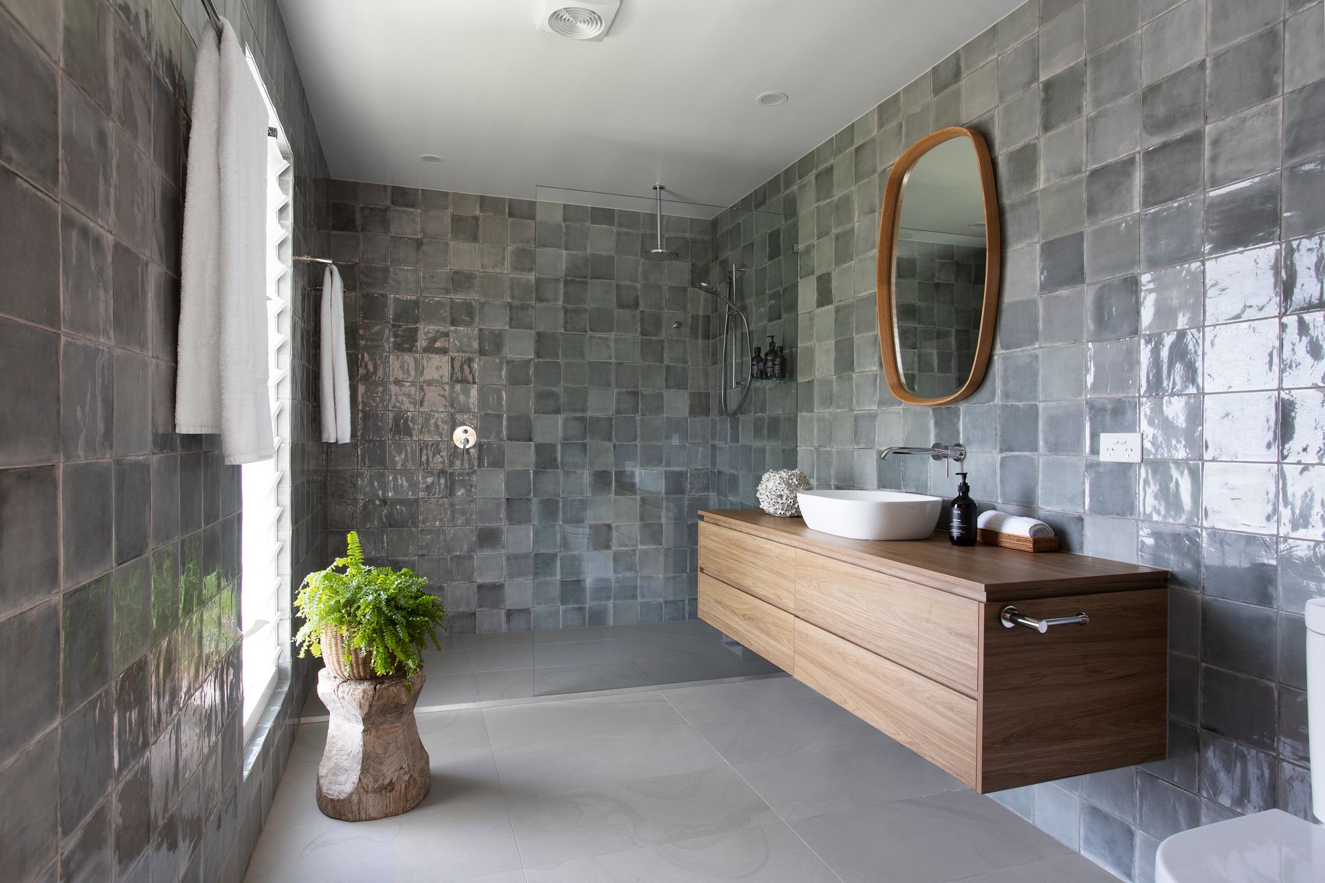 The upstairs zone houses the Master Bedroom (King) with an incredible en-suite with stunning rippled green tiles plus a beautiful light filled Queen bedroom + a kids room ( 1 x single bunk + 1 single bed – sleeps 3) . With an oversized bathroom to service the top floor guests, featuring a lovely bathtub with day spa vibes.