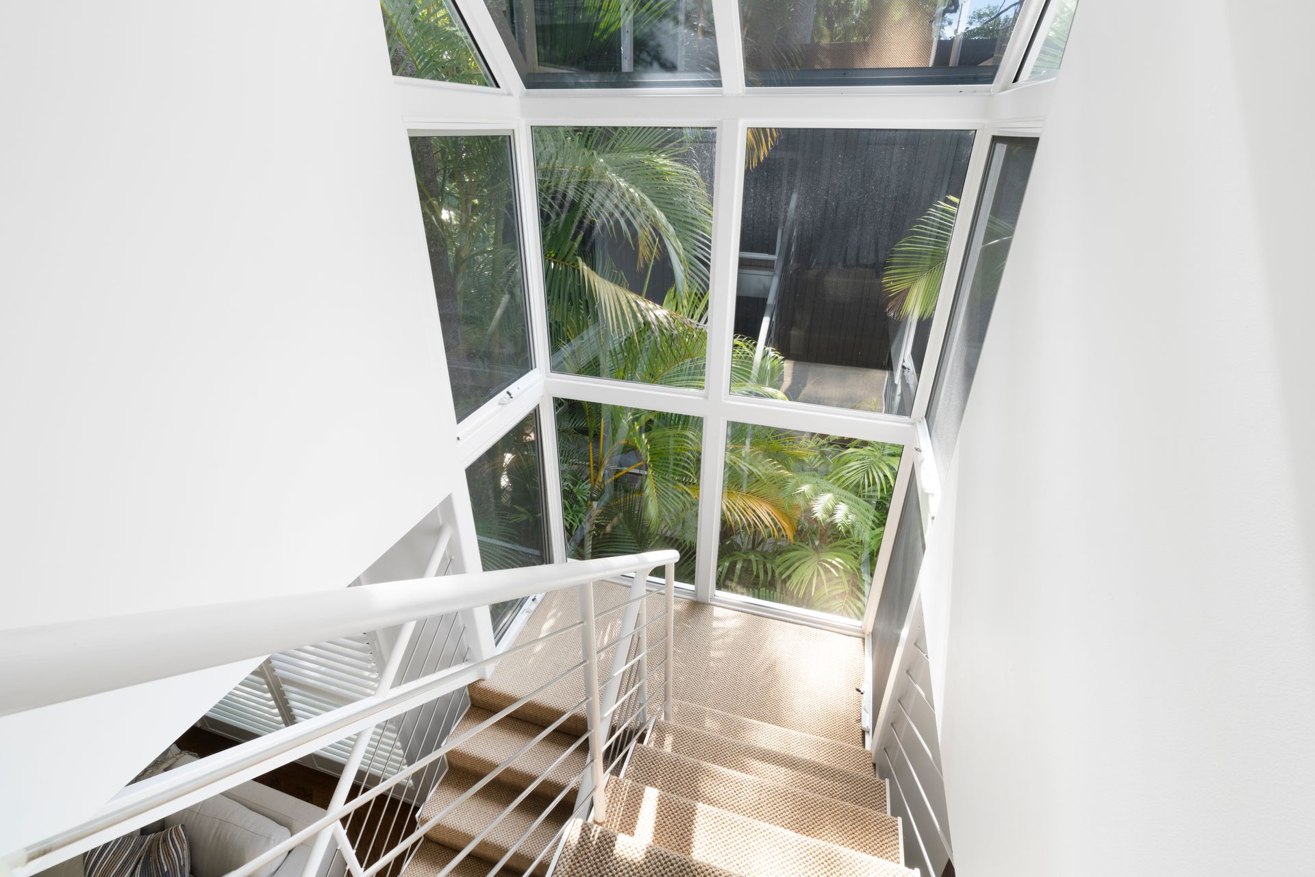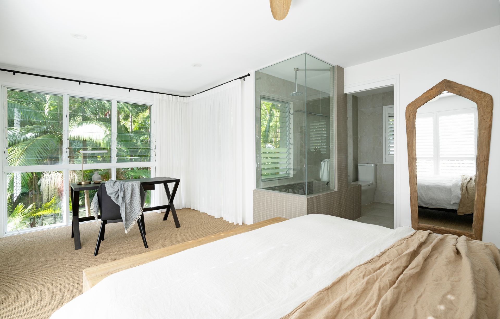The upper level contains the generous king master bedroom (with ensuite) and stunning views complemented by whimsical sheer curtains.
