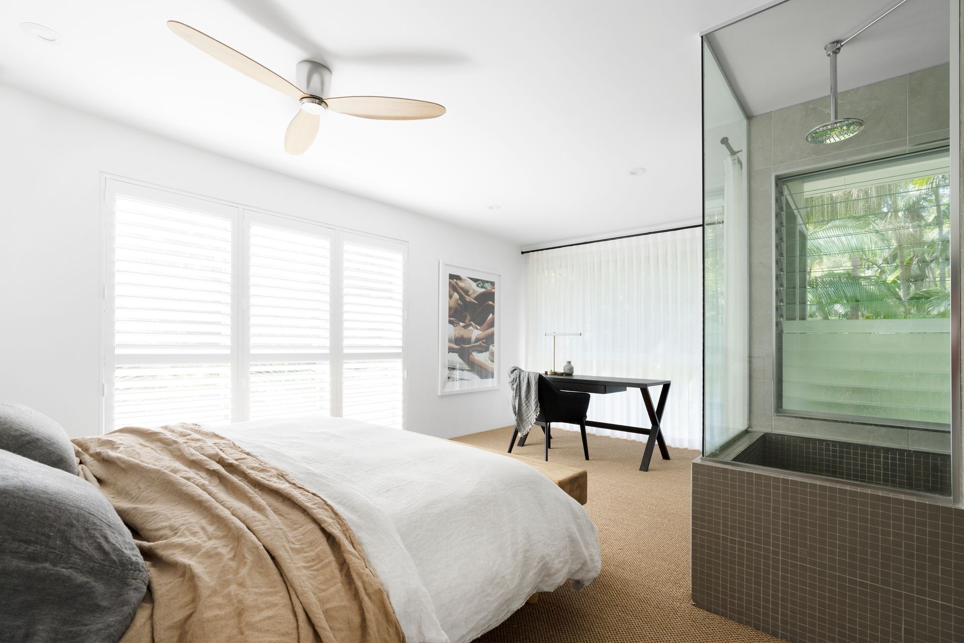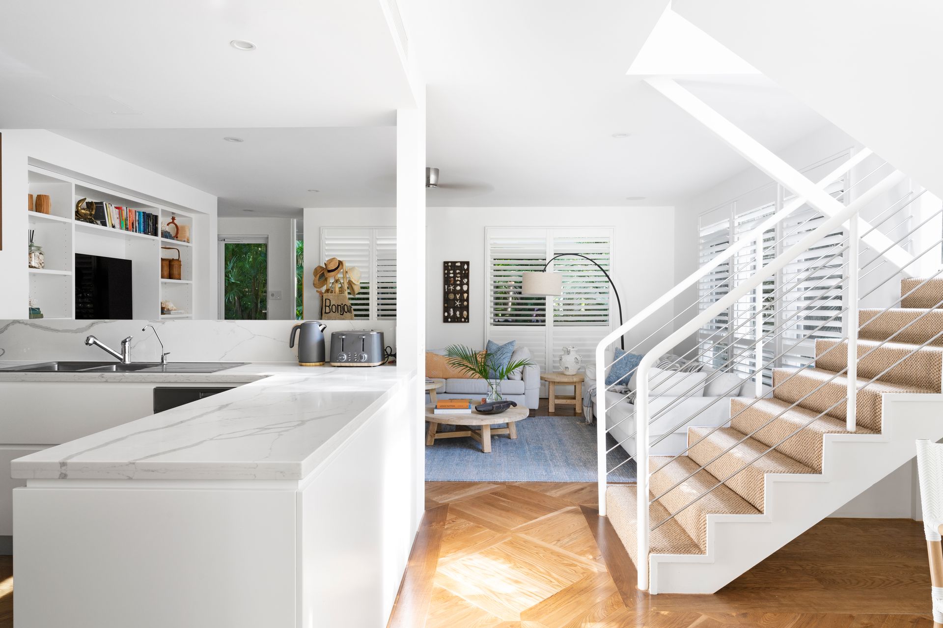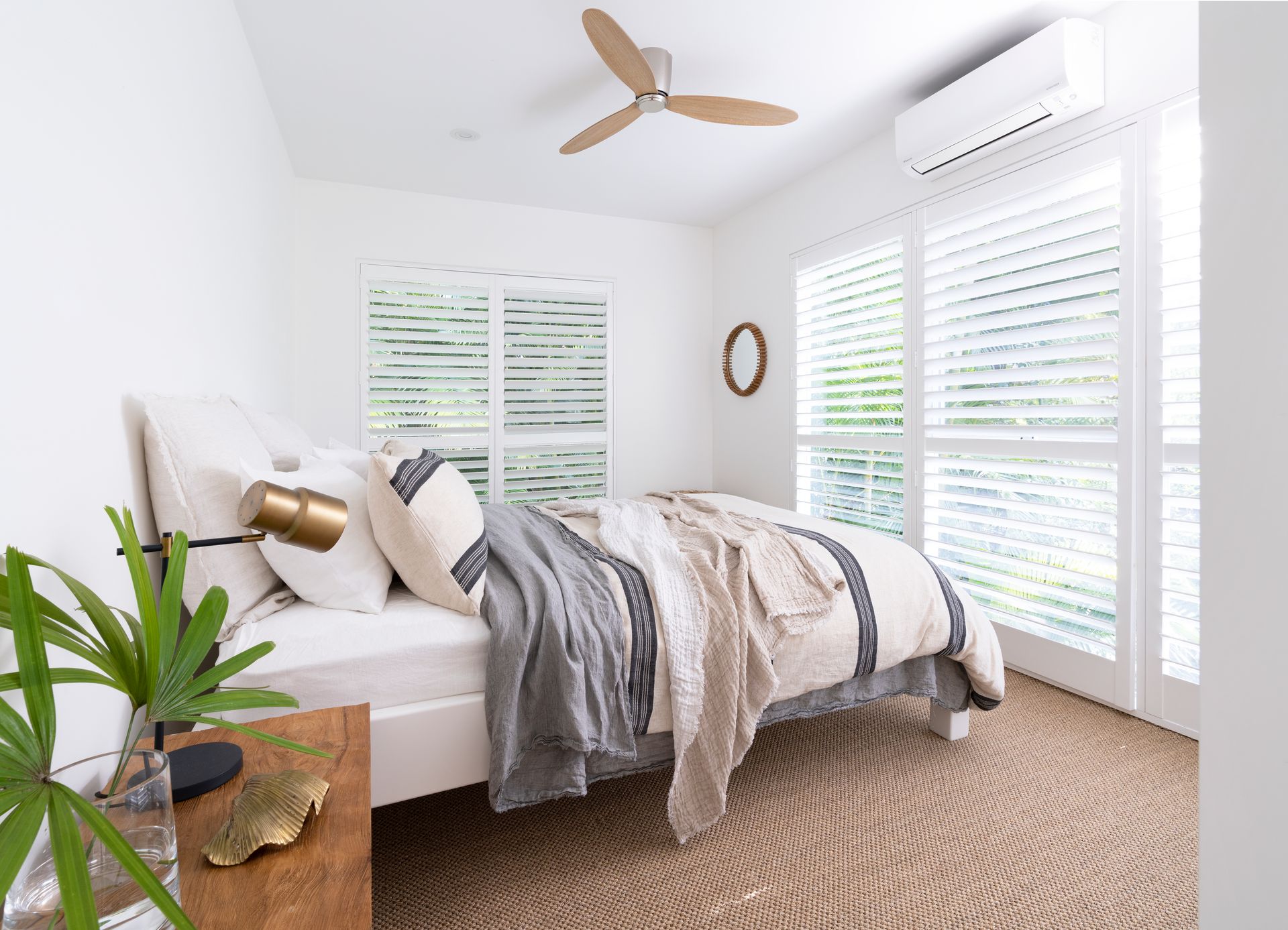The additional 2 bedrooms (1 x Queen + 1 x Queen with single trundle) feature plantations shutters and share a spacious bathroom, all featuring on-trend coastal sisal carpet flooring.